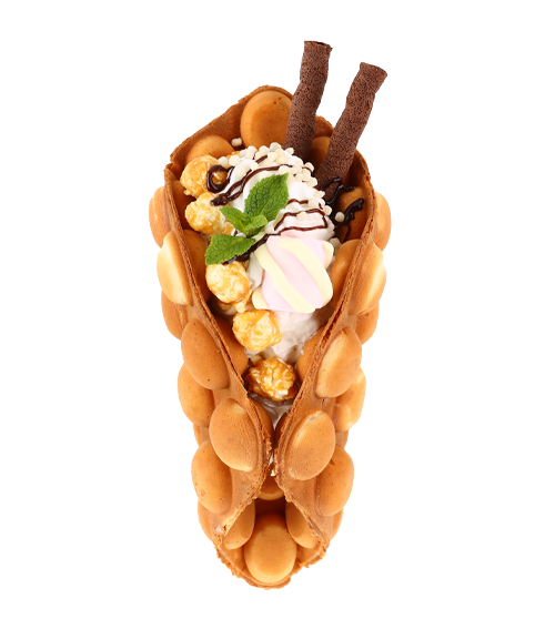 Frisch gebackene Bubble Waffle, gefüllt mit Gelato deiner Wahl, garniert mit Sahne, frischen Früchten und einem unwiderstehlichen Nutella-Topping.
